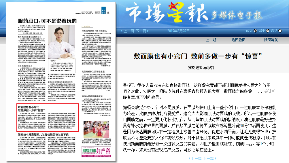 星报讯 很多人喜欢洗完脸直接敷面膜,这样做究竟能不能让面膜发挥它最大的效用呢?对此,安医大一附院皮肤科专家杨森教授告诉大家:敷面膜之前多做一步,会让护肤有意想不到的效果。据杨森教授介绍,针对不同肤质,在面膜的使用上有一些小窍门:干性肌肤本身保湿能力较差,皮肤屏障功能容易受损,这会大大影响肌肤对面膜的吸收,所以干性肌肤在使用面膜之前,一定要用化妆水打底,从而增加肌肤对面膜的接纳度;油性肌肤最好选择具有补水控油效果的面膜,并在敷面膜之前将面膜放在冰箱里冷藏30分钟后再使用,这是因为低温面膜可以在一定程度上改善油脂分泌,促进水油平衡,让毛孔变得细致;护肤品不可避免要加入各种功效成分,对于敏感肌来说其中一种可能就是致敏原,所以在使用新面膜前最好做一次过敏反应的实验,即把少量面膜涂在手腕或耳后,等1个小时洗干净,如果没有出现红痒反应,可放心敷在脸上。
