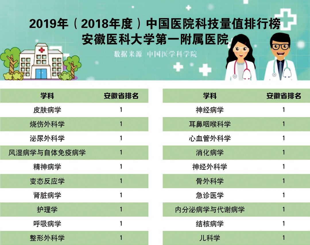 安医大一附院共有27个学科进入前100位,其中皮肤病学(第9名)、烧伤外科学(第10名)、泌尿外科学(第23名)、风湿病学与自体免疫病学(第23名)、精神病学(第27名)、变态反应学(第28名)、肾脏病学(第35名)等排名全国靠前。在29个学科分省榜单中,医院有20个学科位居安徽省第一,综合实力稳居安徽省首位。