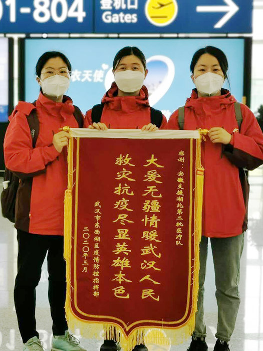 我校此批返回的支援湖北医疗队队员,包括第一附属医院、第二附属医院、第四附属医院、附属巢湖医院和附属阜阳医院各3人。其中,一附院沈霞、张婷婷,二附院何晓丽、王磊,四附院何春林、附属巢湖医院周宇鹏和附属阜阳医院位苗苗,因在方舱医院工作期间表现突出,被武汉东西湖方舱医院党委授予了“先进标兵”荣誉称号。