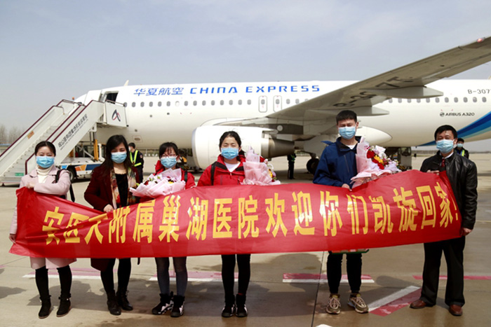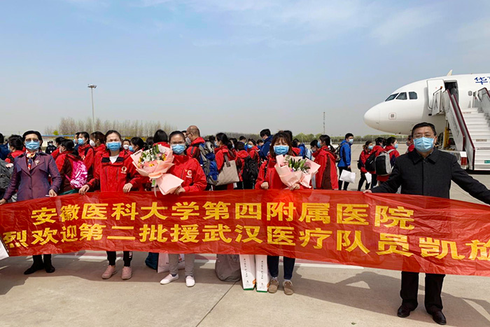 319日上午,安徽省第二批、第八批支援湖北医疗队共130名队员圆满完成支援任务,搭乘专机平安返回合肥。我校各直属附属医院15名战“疫”英雄不畏艰险、不负重托,在圆满完成支援任务后,随队返回。省卫健委副主任杜昌智、崔礼军带队前往机场迎接英雄凯旋。我校各直属附属医院相关负责人在机场迎接队员回家。