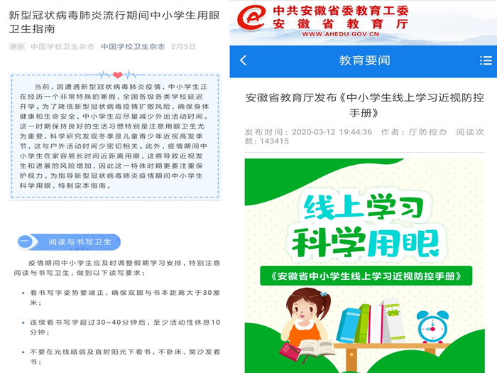 此次疫情防控期间,陶芳标团队整合近十年的原创性研究成果,精心制作了《新型冠状病毒疫情期间中小学生用眼卫生指南》《安徽省中小学生线上学习近视防控手册》,并先后发布于《中国学校卫生》杂志微信公众号及安徽省教育厅官方网站。本次国家卫健委《指引》在指南和手册的基础上,结合全国多地确定返校复学时间的具体情况,提出了系统性、针对性更强的指导意见。《指引》编写过程中,陶芳标还邀请了北京、上海、江苏、天津、武汉、广州等多地专家开展咨询与研讨。