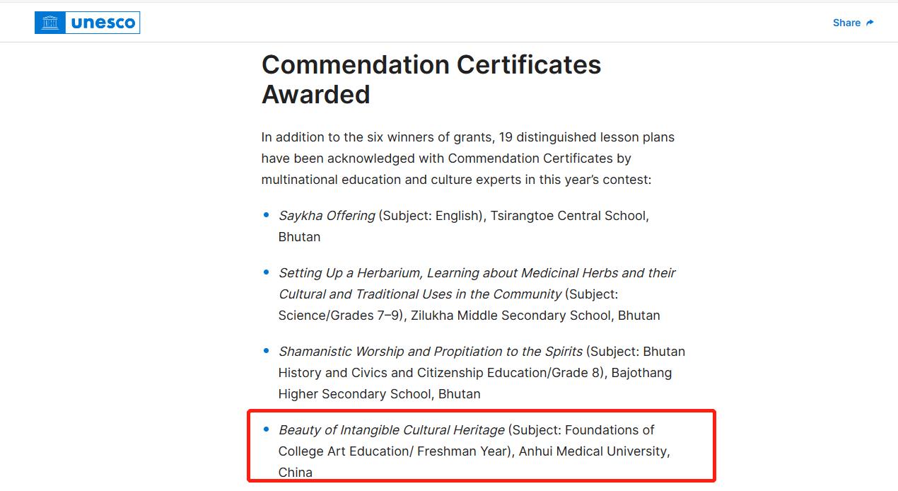 近日,联合国教科文组织亚太地区公布2023年活态遗产课程计划评选结果,我校人文医学学院美育教学部递交的教案《非物质文化遗产之美(Beauty of Intangible Cultural Heritage)》,获“活态遗产教案竞赛奖”。此次我国共有3个项目获奖,我校是获奖的唯一高校。