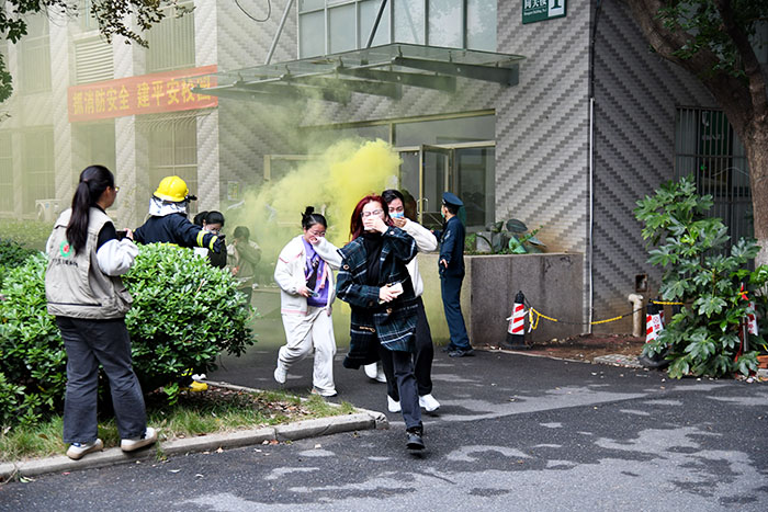 启动仪式前,学校开展了高层消防疏散逃生演练活动。中午12点30分,接到演练总指挥指示后,现场指挥员按程序发出演练指令,尚美楼1号学生公寓门前立刻烟雾滚滚,消防警报声随即响起。公寓内的学生在疏散引导员的带领下,捂住口鼻,低姿行走,迅速从各楼层有序撤离至室外安全区域。短短几分钟时间,1000余名学生迅速疏散至安全区域。