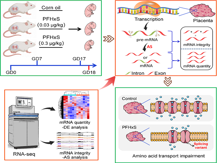 该研究首次构建了孕期暴露人群真实剂量PFHxS暴露致IUGR小鼠模型,提出了全基因表达和选择性剪接相结合的多组学研究方法,并从信使核糖核酸(mRNA)表达量和完整性的全新视角,揭示PFHxS的关键发育毒性作用机制。研究发现,孕期PFHxS暴露导致多种氨基酸转运体基因表达抑制和选择性剪接改变损害胎盘氨基酸转运,引起胎盘发育不良,并最终诱发IUGR。该研究为防治IUGR提供了理论基础和实验室证据,也为环境毒理学研究提供了全基因表达与选择性剪接相结合的组学分析策略。