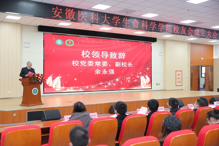 余永强表示,生命科学学院校友会成立正值新年之际,处处洋溢着欢乐祥和的喜庆氛围。如今的生命科学学院进入发展快车道,在科研创新、学科建设、人才培养等各方面的实力日益显现。他指出,广大校友是学校最宝贵的资源,是母校永不褪色的名片,是学校建设发展的重要支撑力量。学校发展的每一次辉煌跨越,都离不开各位校友拼搏奋斗和倾情付出。希望全体生科校友以校友会为平台,以产学研为载体,以谋发展为目标,以促交流为根本,以共进步为主题,广泛交流、深入探讨、共同研究、积极合作,弘扬“弘毅担当、精医报国、康民济世”的安医精神,为进一步推动学院高质量发展,为加快建成国内一流高水平医科大学努力贡献更多的智慧和力量。