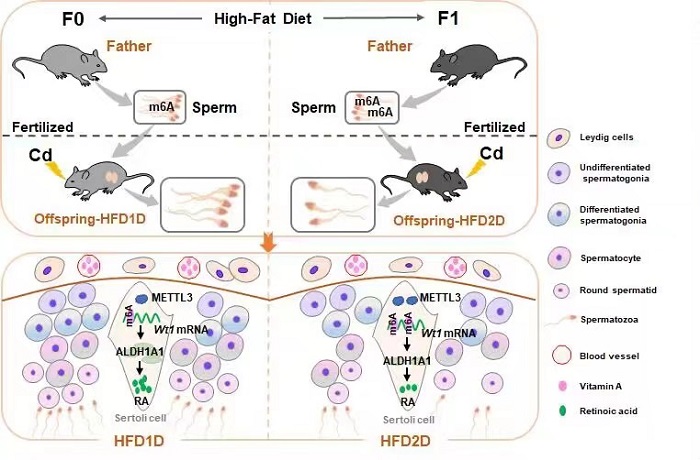 该项目在成功建立父源性不育症动物模型基础上,发现多代父体肥胖升高子代精子发生障碍易感性;基于m6A-mRNA&lncRNA表观转录组芯片、RNA测序以及生物信息学分析,发现多代父体肥胖降低子代睾丸Wt1表达和升高其m6A修饰水平;通过睾丸局部注射AAV9-Wt1,揭示Wt1下调介导的视黄酸信号受阻在多代父体肥胖加重子代精子发生障碍易感性中发挥关键作用;通过体内m6A修饰抑制剂STM2457处理和体外Mettl3 siRs处理,阐明精子源m6A修饰水平升高对多代父体肥胖下调子代睾丸Wt1表达的影响;基于人群病例-对照研究,验证精子m6A水平与体质指数存在正向关联,与精液质量存在负向关联。总之,多代父体肥胖通过下调Wt1 mRNA表达,逐渐升高子代精子发生障碍易感性,且METTL3介导的精子m6A修饰参与父体肥胖引起子代睾丸Wt1 mRNA稳定性降低。该研究结果为筛选父体不良因素暴露损害子代精子发生的表观遗传标志物提供实验证据,也为今后制定父源性不育症的早期防治策略提供重要参考。