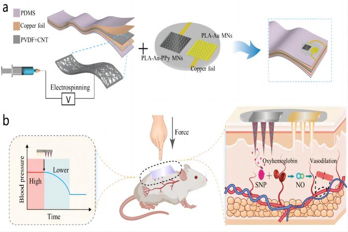 高血压急症是一种临床综合征,其特点是高血压患者的血压因特定诱因而突然大幅升高,可能导致危及生命的后果。静脉注射硝普钠常用于快速降低血压,然而其特殊性限制了它在紧急情况下急救或自救的适用性。针对这一问题,我校低温生物医学与组织工程团队开发了一种自供电、可控的微针给药系统。该系统主要由聚偏氟乙烯和碳纳米管制成的压电薄膜自供电模块,以及由聚乳酸-金微针和聚乳酸-金-聚吡咯微针组成的微针释药模块两部分组成。