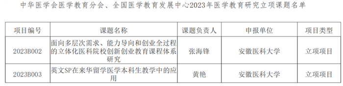 2023年度医学教育研究课题项目和教学成果征集活动由中华医学会医学教育分会和全国医学教育发展中心联合发起,得到全国高校的积极响应,包含我校在内的10所高校获2023年度“高质量教师发展与教学示范课成果推荐高校”。此外,全国132所医学院校及各专业委员会共1032项课题参与评选“2023年度医学教育研究课题项目”,最终417项申报课题予以立项,我校张海峰负责的《面向多层次需求、能力导向和创业全过程的立体化医科院校创新创业教育课程体系研究》,黄艳负责的《英文SP在来华留学医学本科生教学中的应用》获批立项。