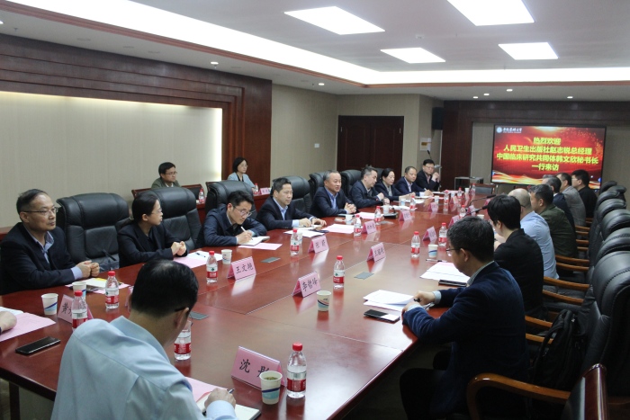 4月16日下午,人民卫生出版社人卫(北京)医学科技传媒有限公司总经理陈鹏、中国临床研究共同体联合召集人兼秘书长韩文欣一行来我校调研交流。校长翁建平出席会议并讲话,副校长吕雄文主持会议。