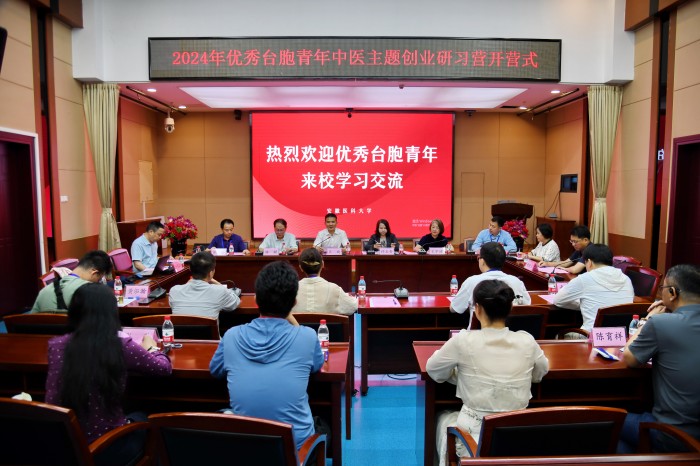 6月14日,优秀台胞青年中医主题创业研习营开营式在我校举办,校党委书记王琦出席开营式并致欢迎辞。全国台联台胞事务部副部长许玉香、综合处副处长王利华,安徽省台联会长林敏、副会长王宇靖、办公室主任曾峰,校党委常委、统战部部长顾秀平参加开营式。开营仪式由林敏主持。